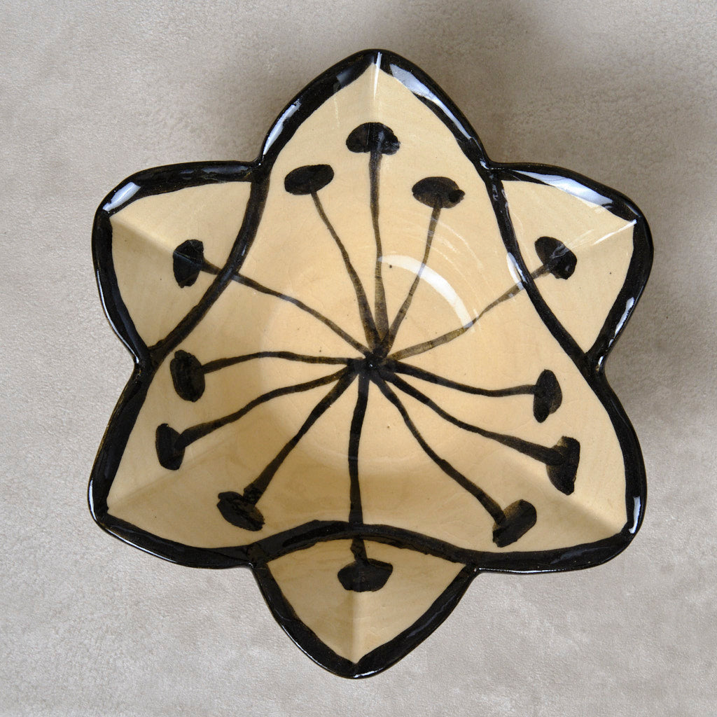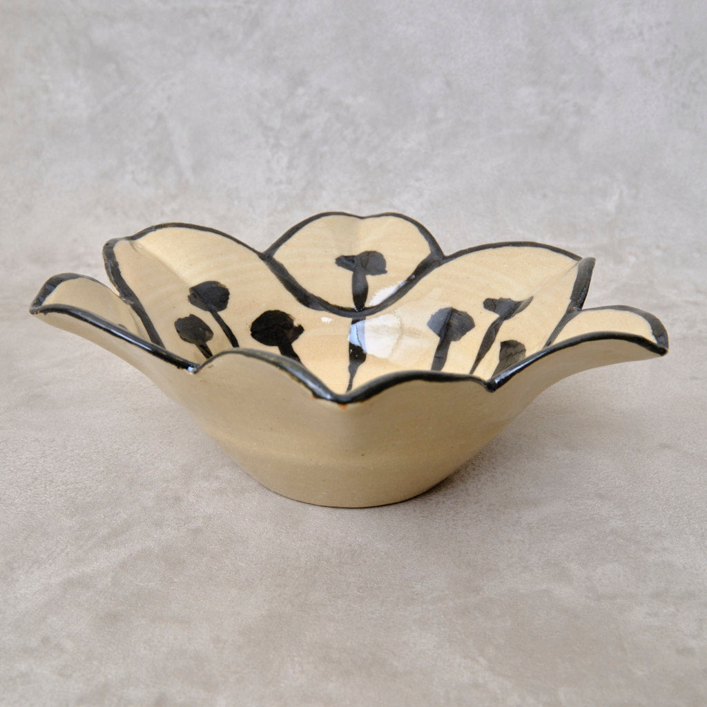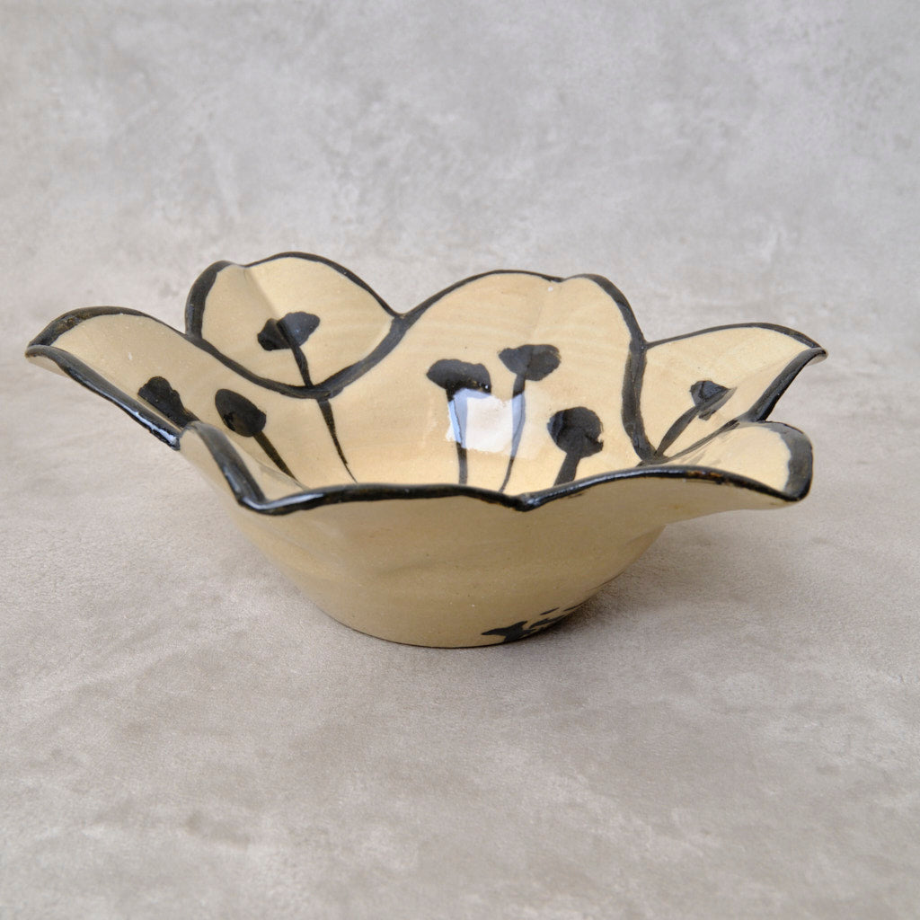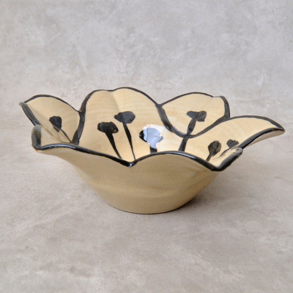 淡い生成りの釉肌に、のびやかな線で描かれた花弁の文様。