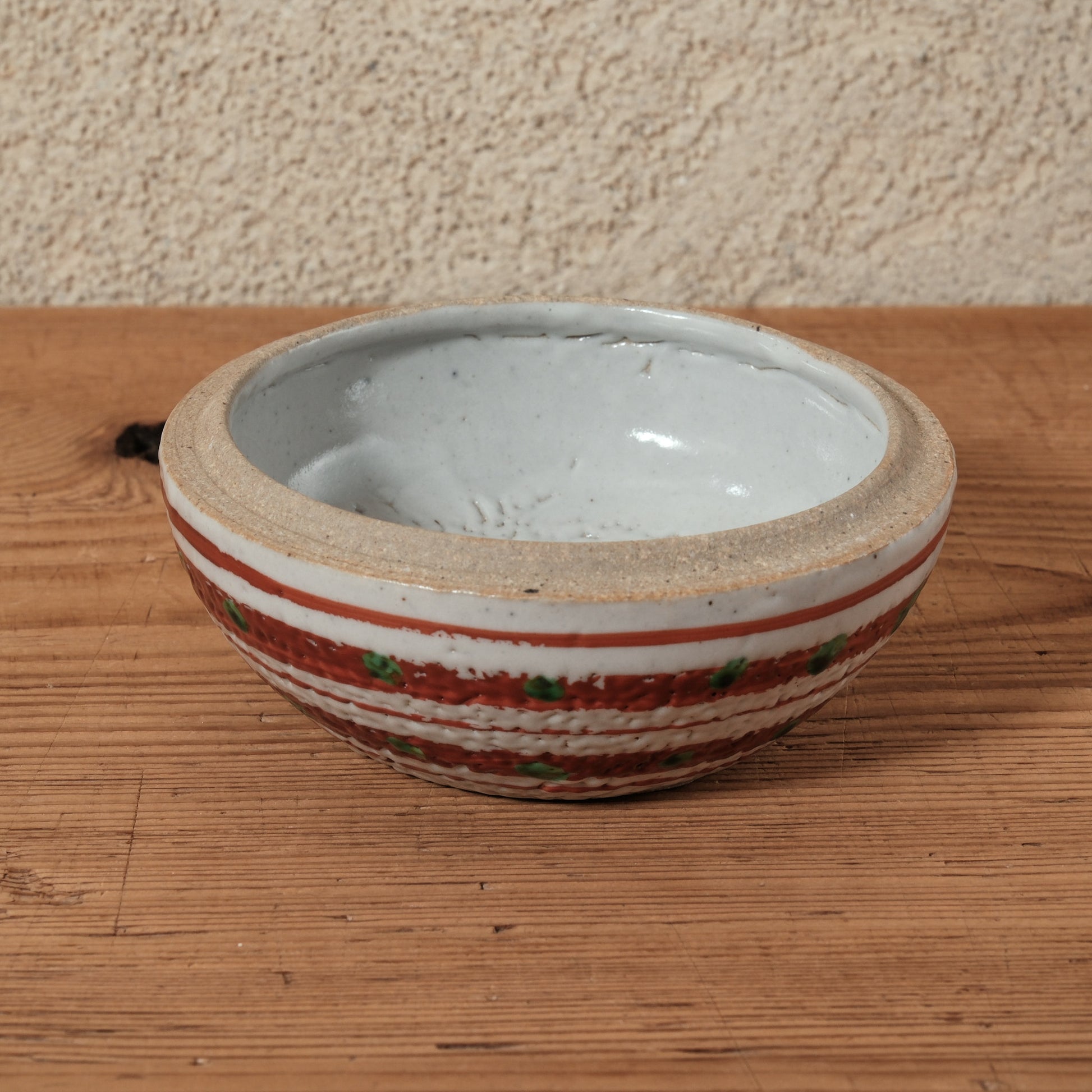 泥並白釉のやわらかな白地に、赤と緑の絵付けが軽やかに舞い、