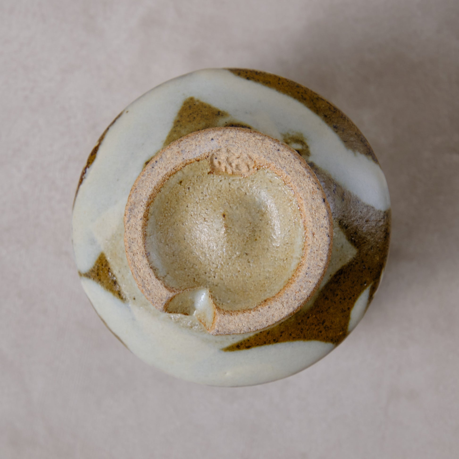 深みのある褐色の地に白釉が静かに重なり合い、落ち着いた趣を見せています。