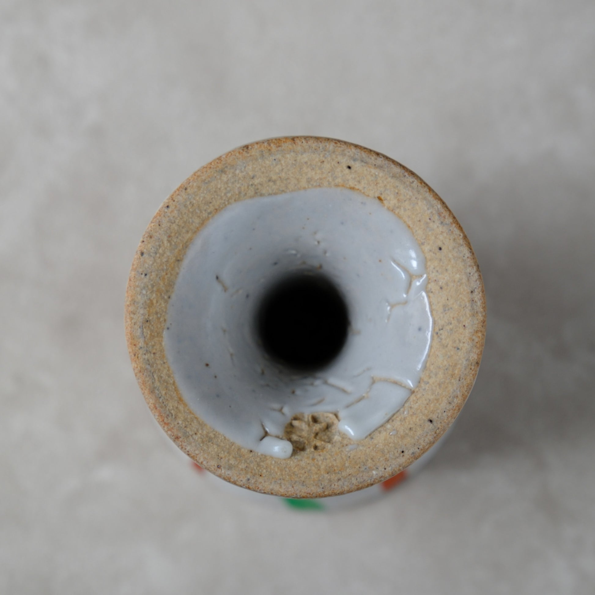 泥並白釉の上に浮かぶ赤と緑の彩が軽やかに調和し、梅花皮(かいらぎ)のようなちぢれた肌が深みを添えています。