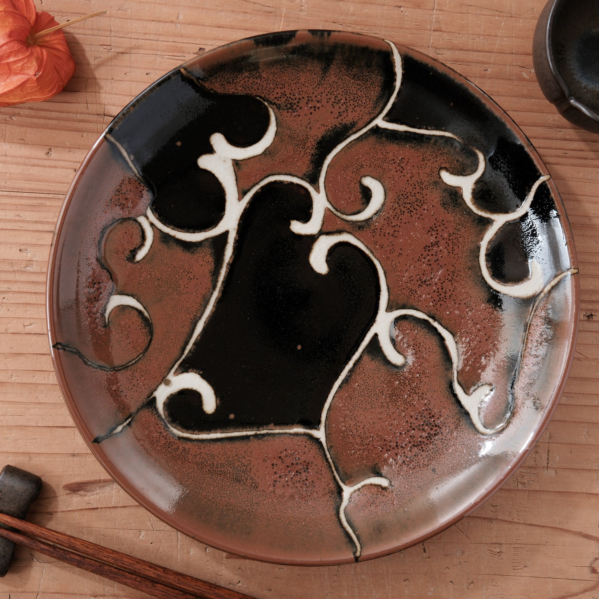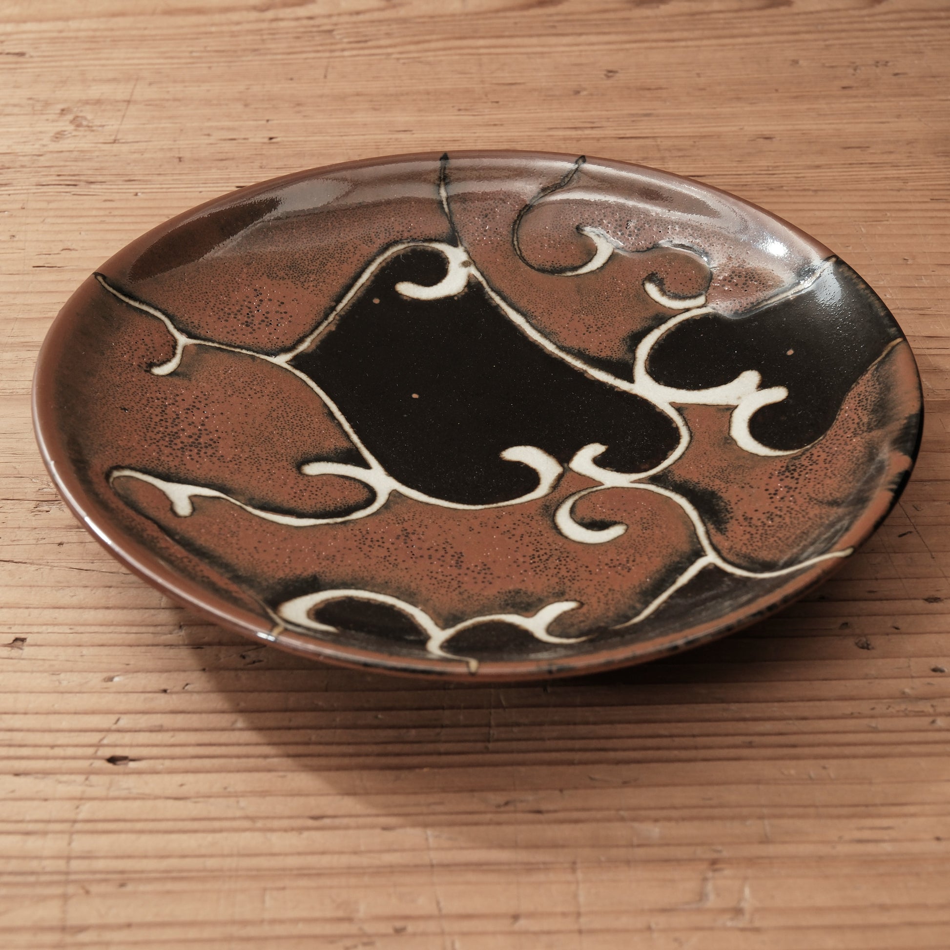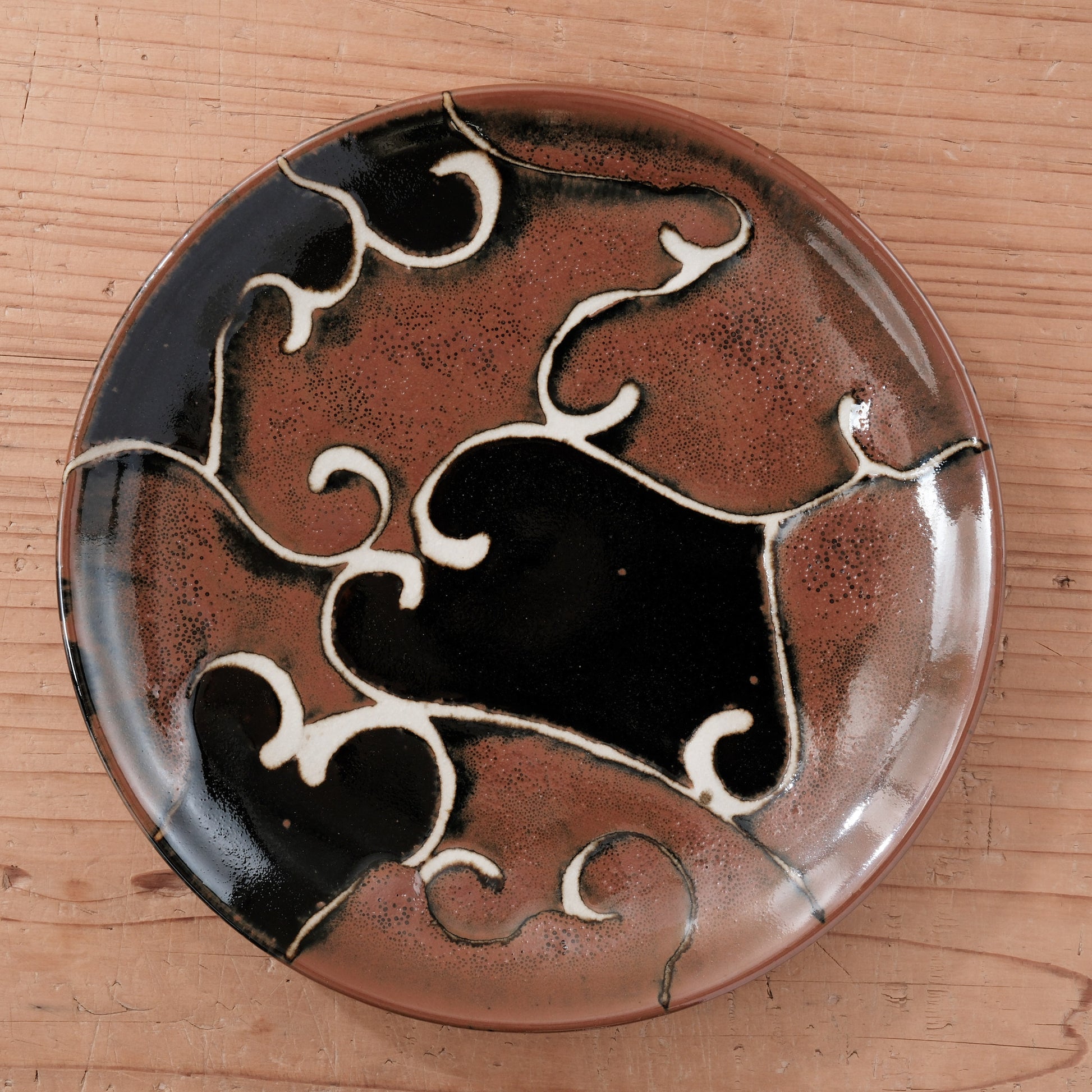 深みのある柿釉の地に、抜絵による白い文様が力強く浮かび上がる、7寸サイズの中皿です。