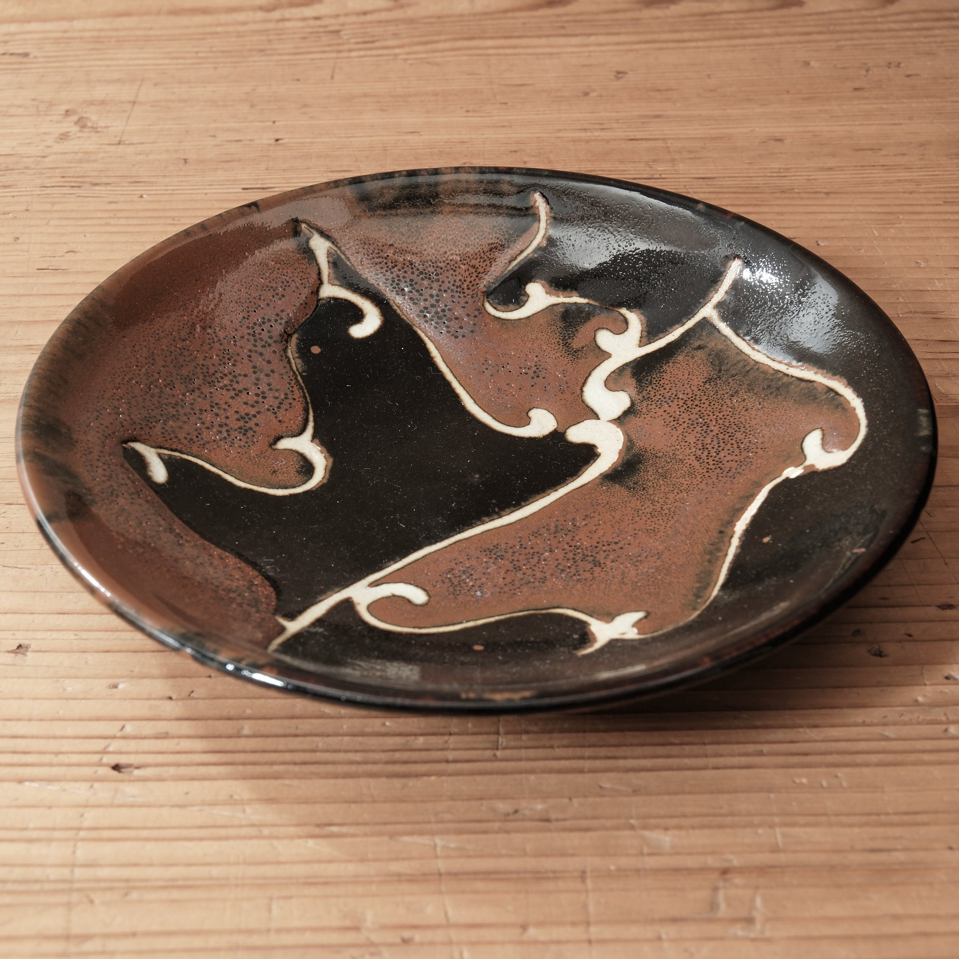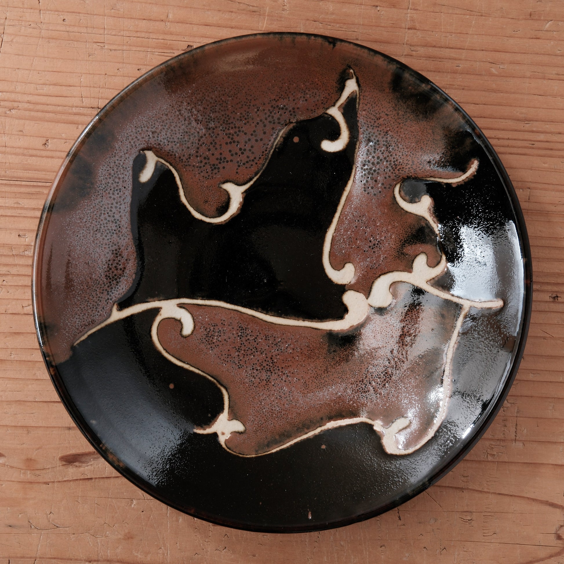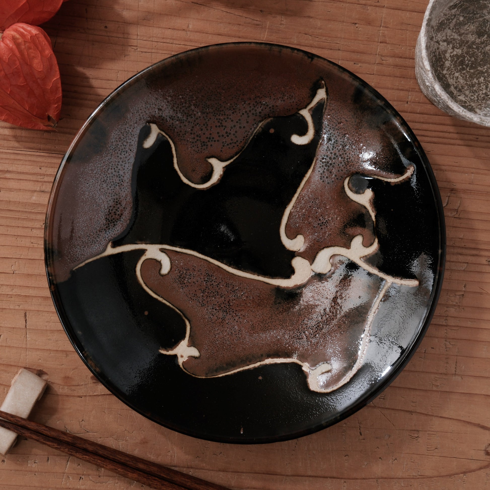 深みのある柿釉の地に、抜絵による白い文様が力強く浮かび上がる、7寸サイズの中皿です。