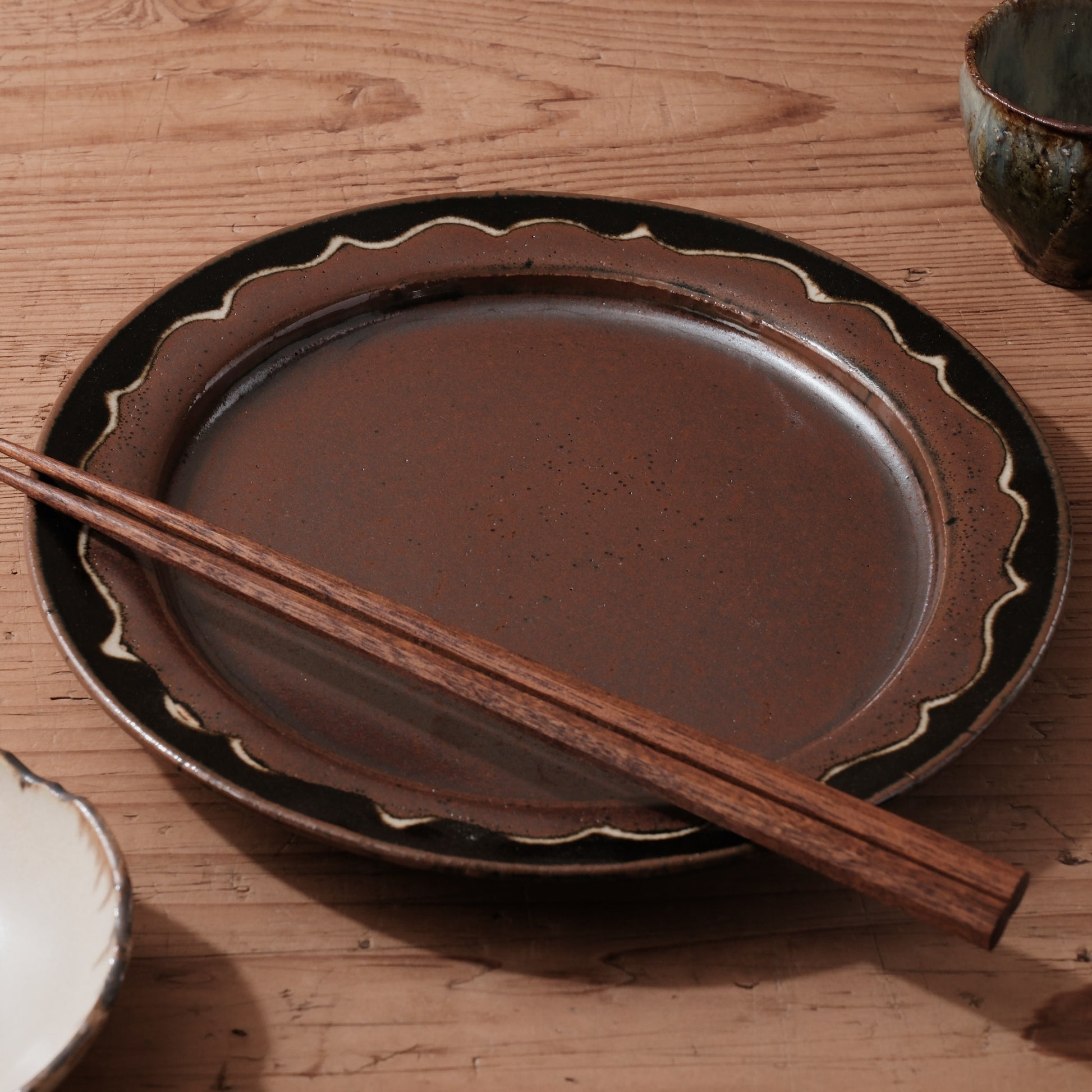 柿釉と黒釉が重なり合う、深みのある表情が魅力の7寸中皿です。