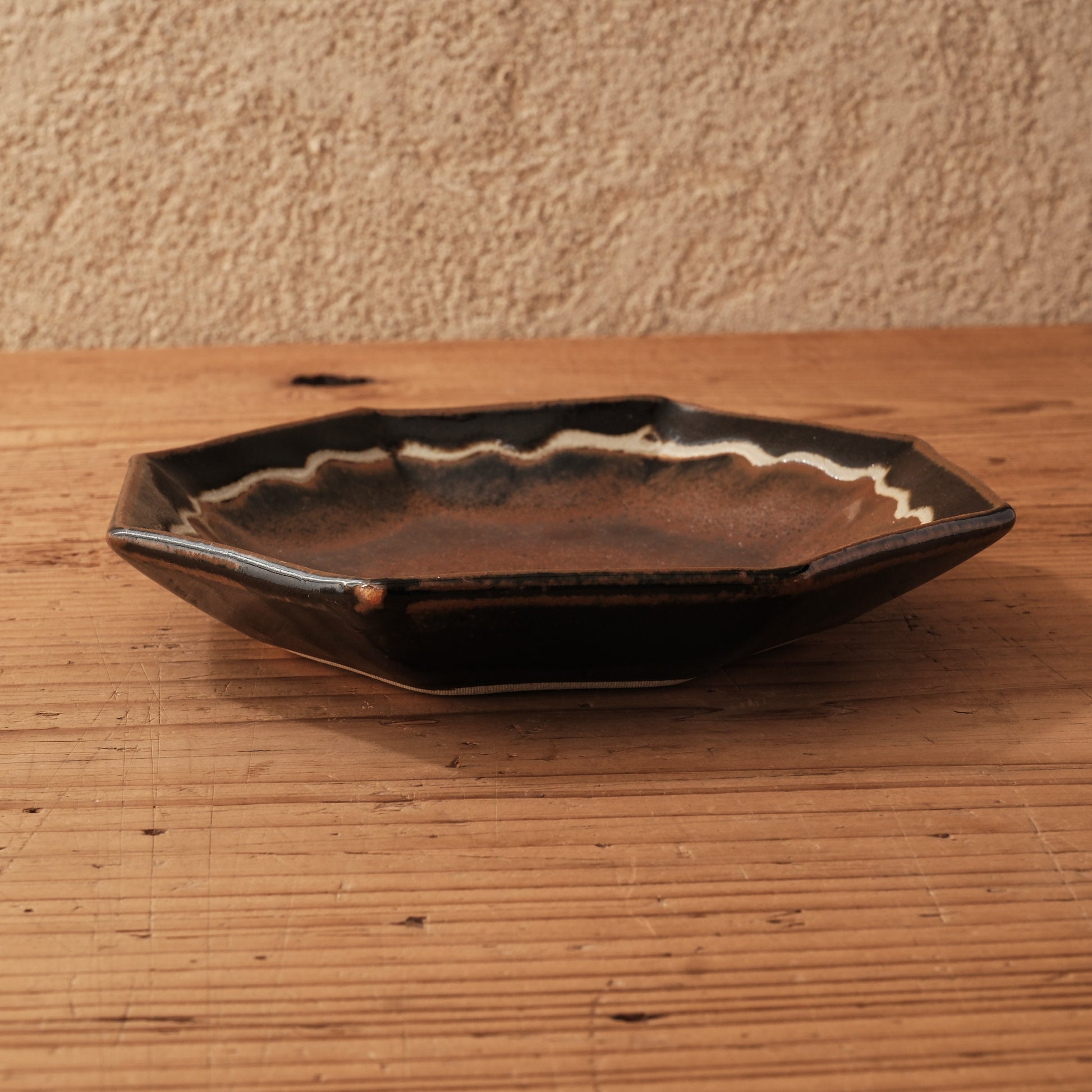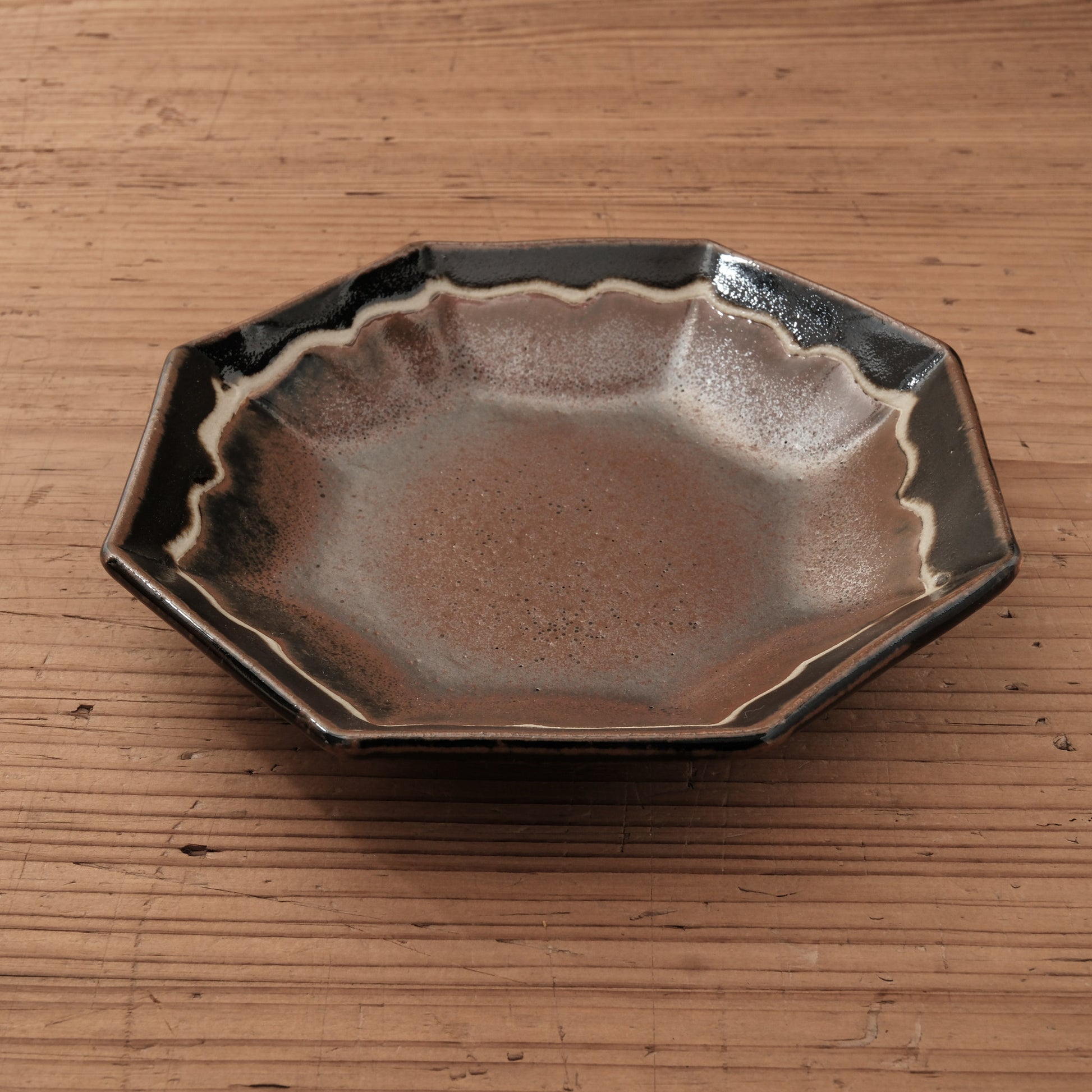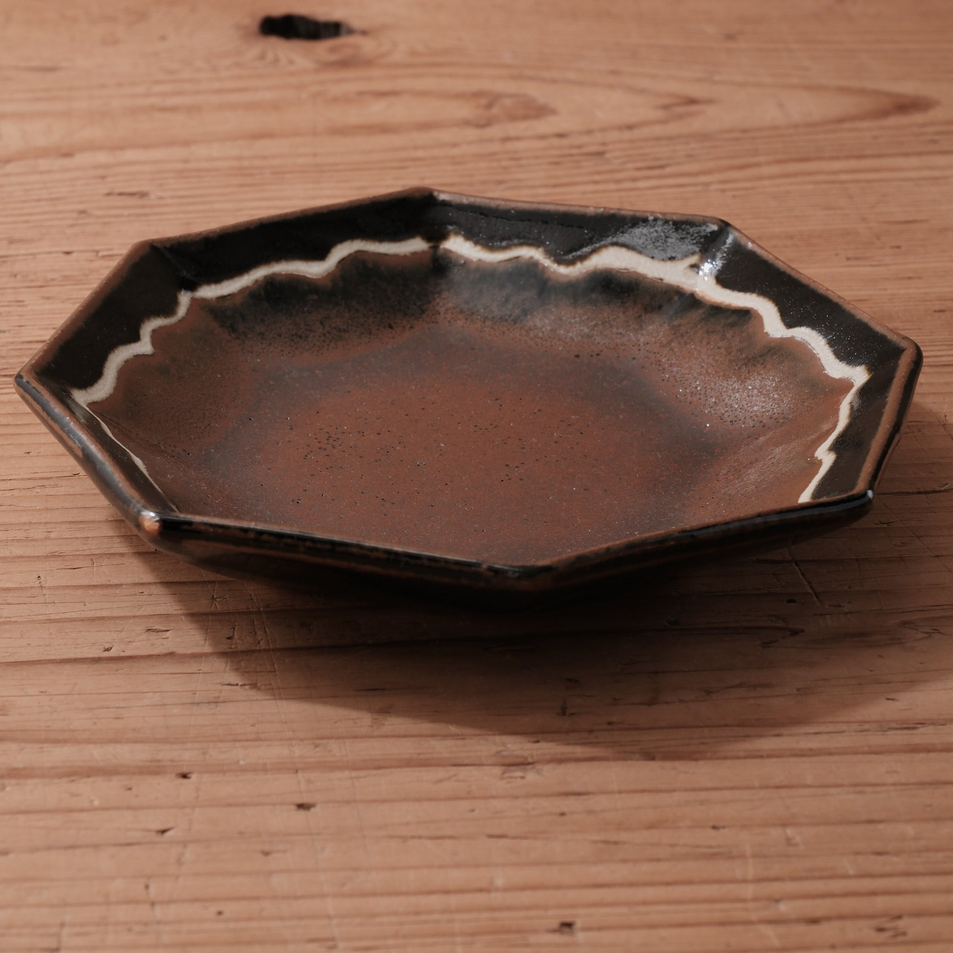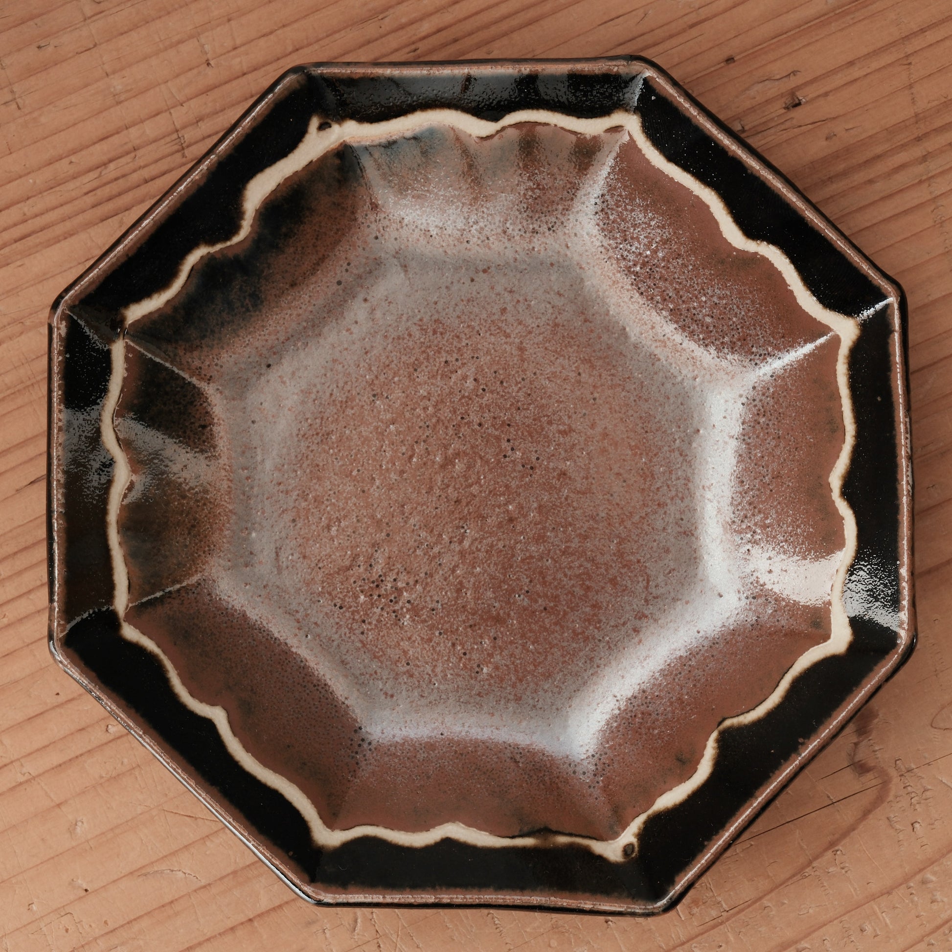 八角形の輪郭に、やわらかな波縁を施した、柿黒釉の6寸中鉢です。