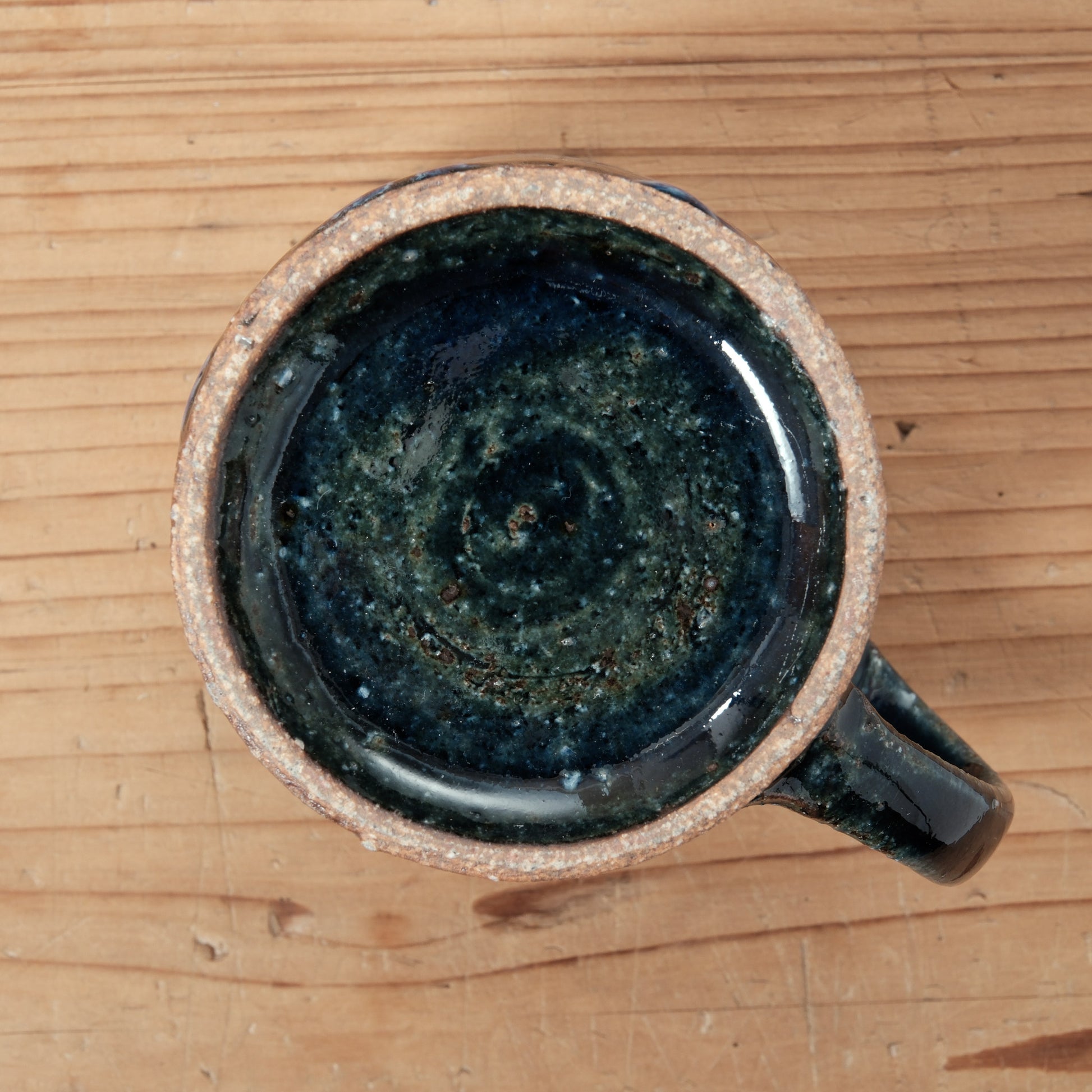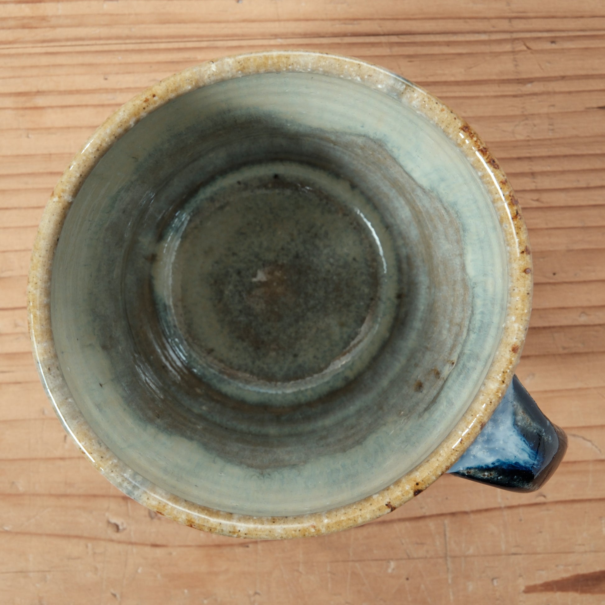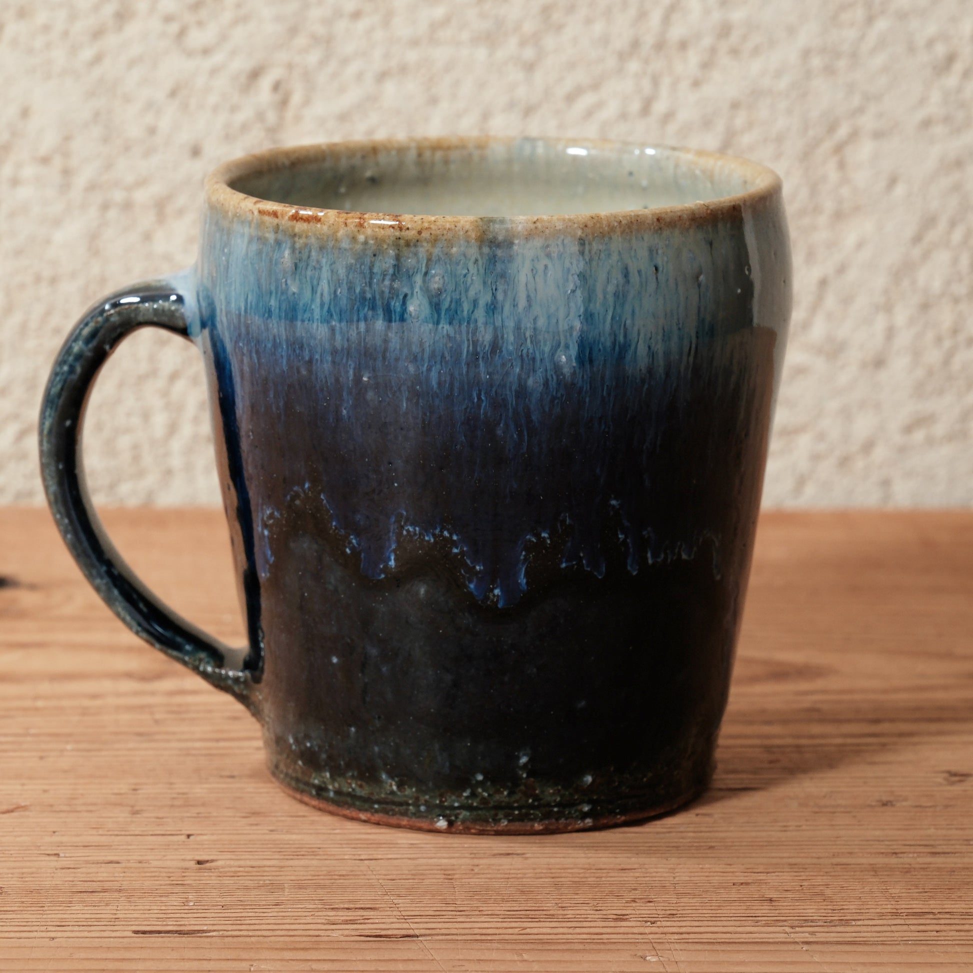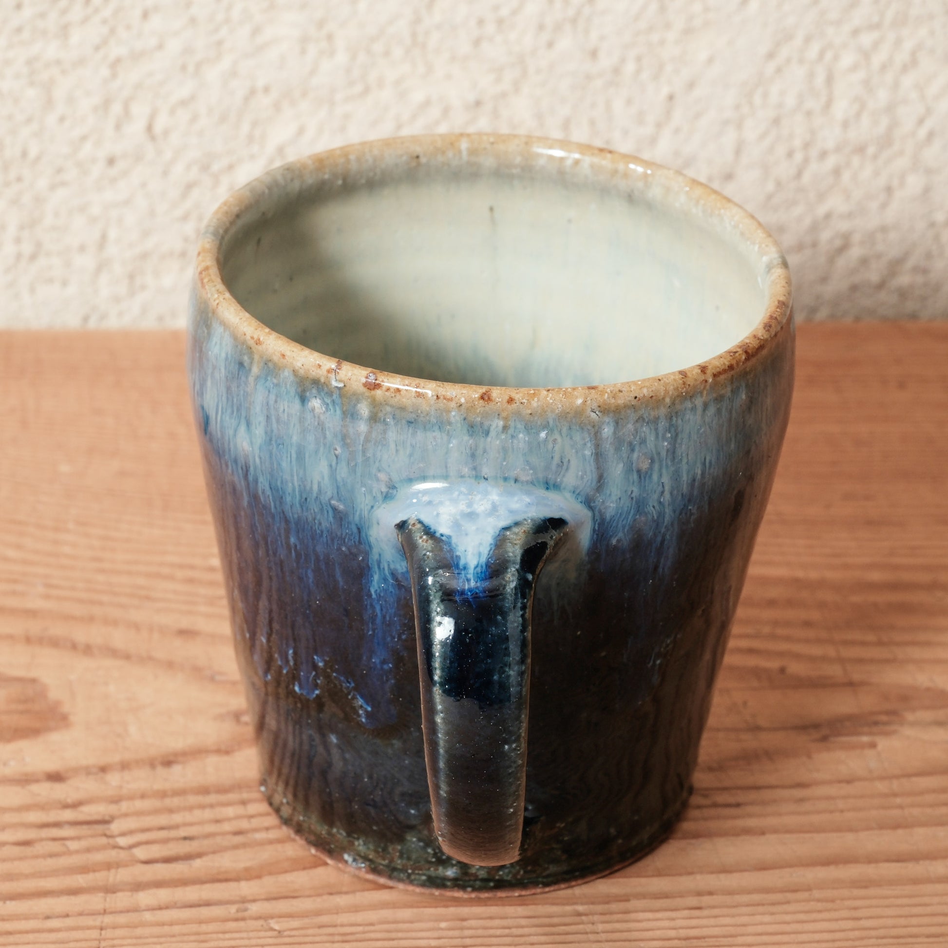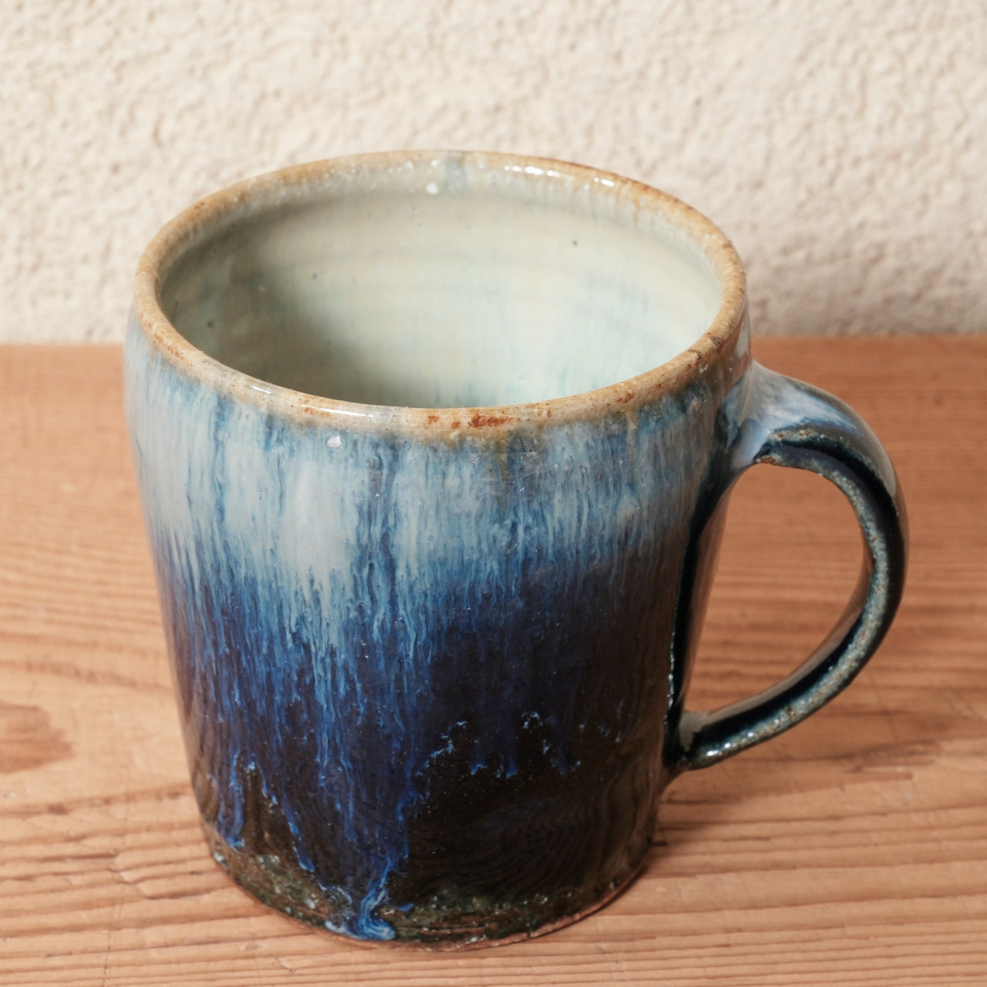 深みのある青釉が、カップ全体を包み込むように流れたマグカップです。