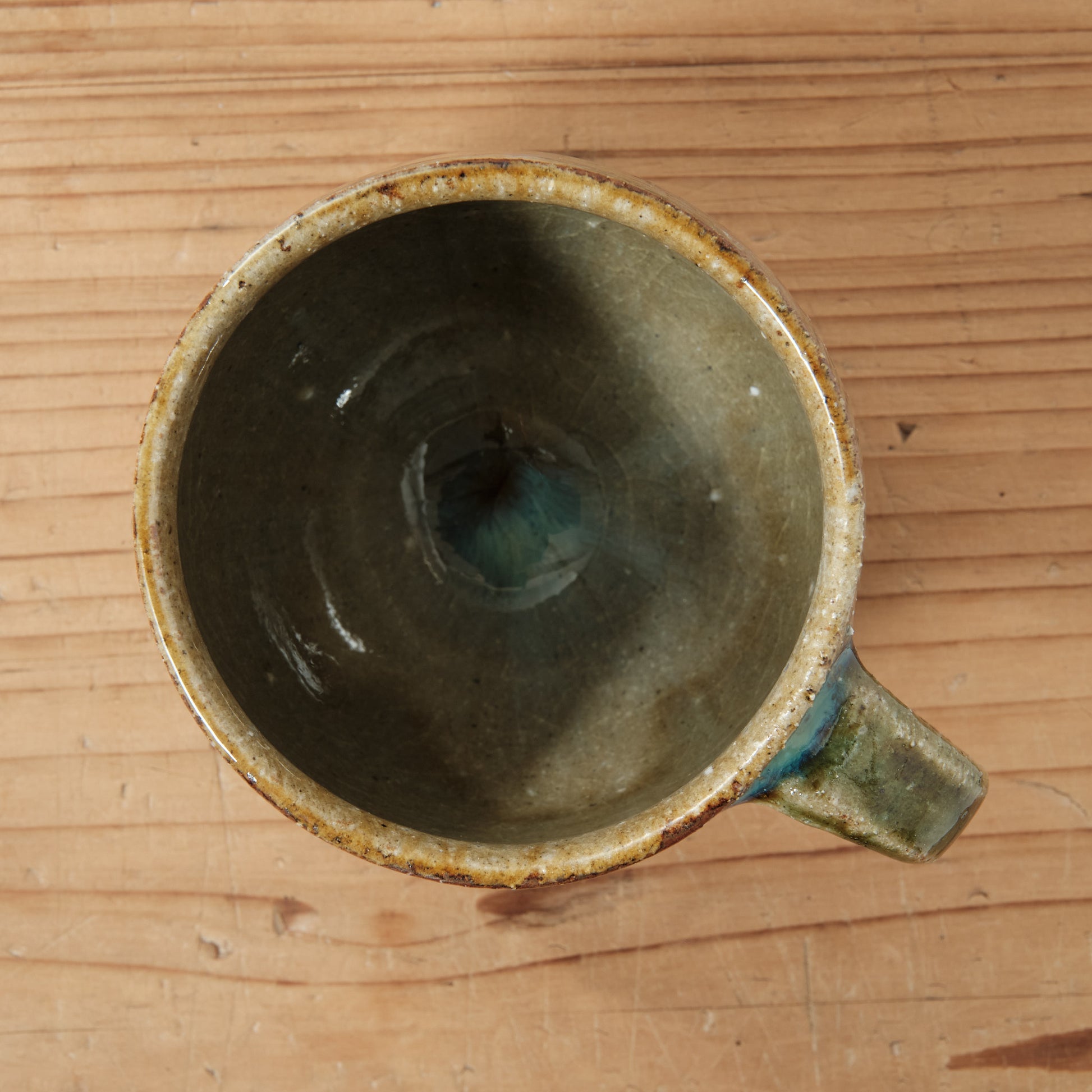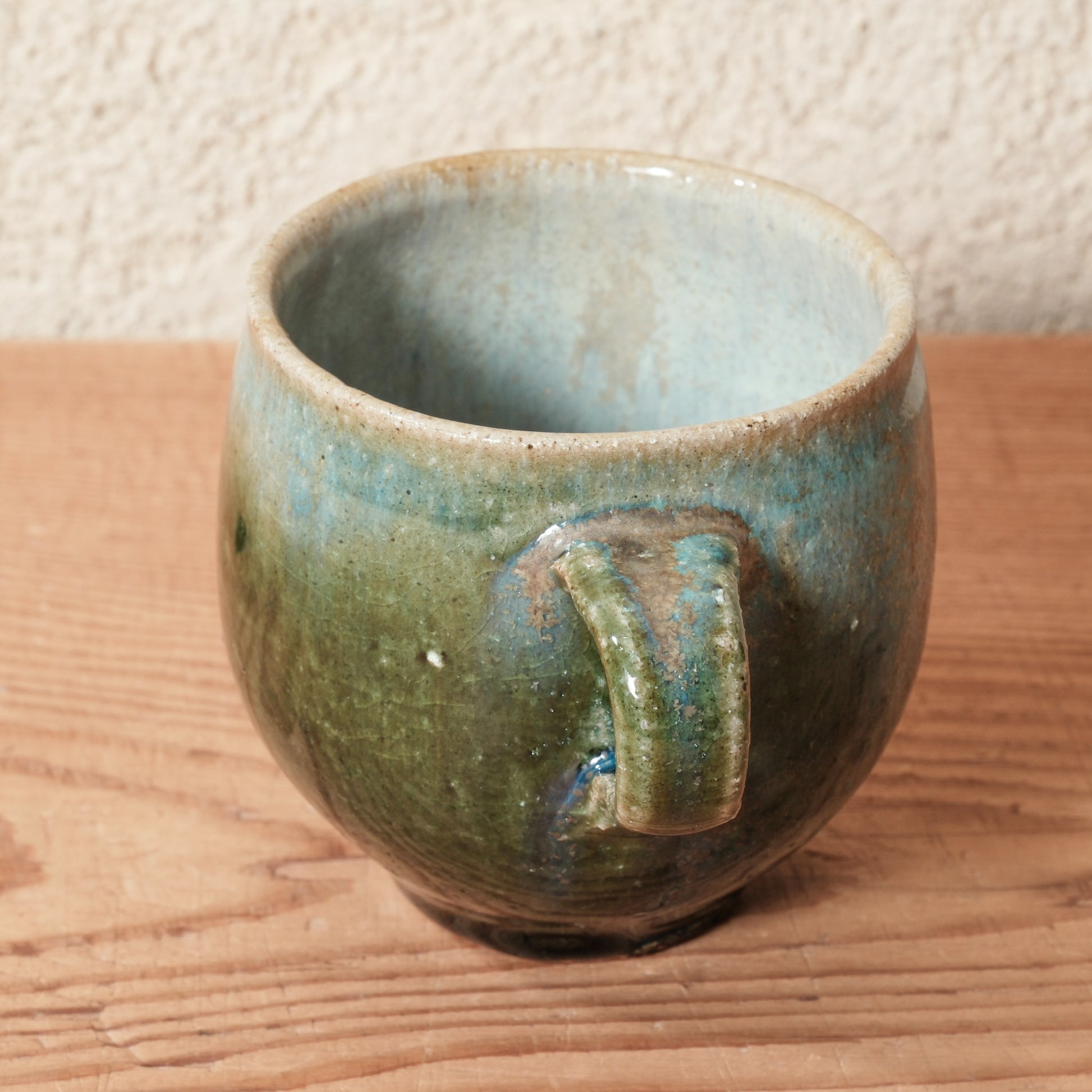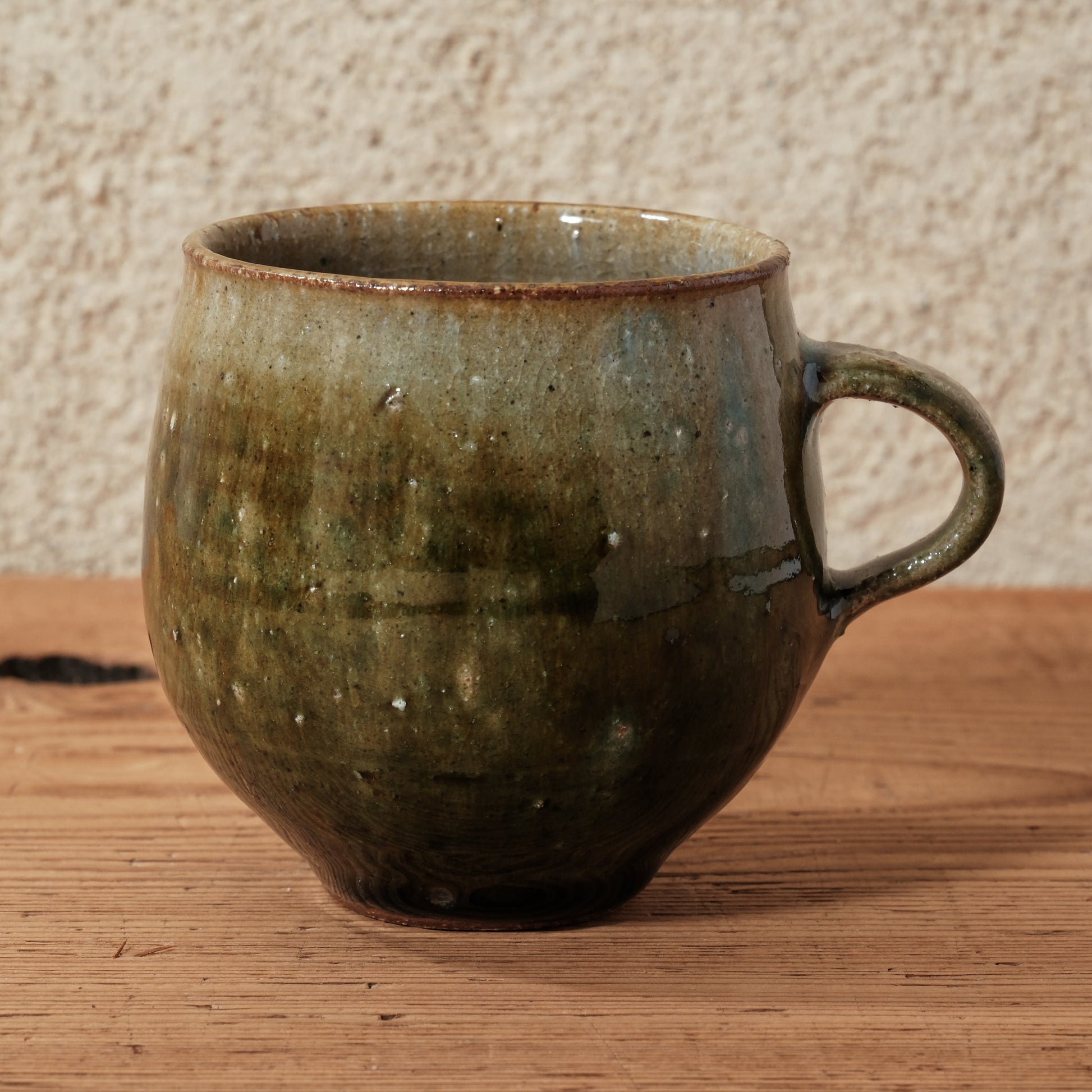 ふっくらとした丸みのあるフォルムに、織部釉の深い緑がしっとりと馴染んだマグカップです。