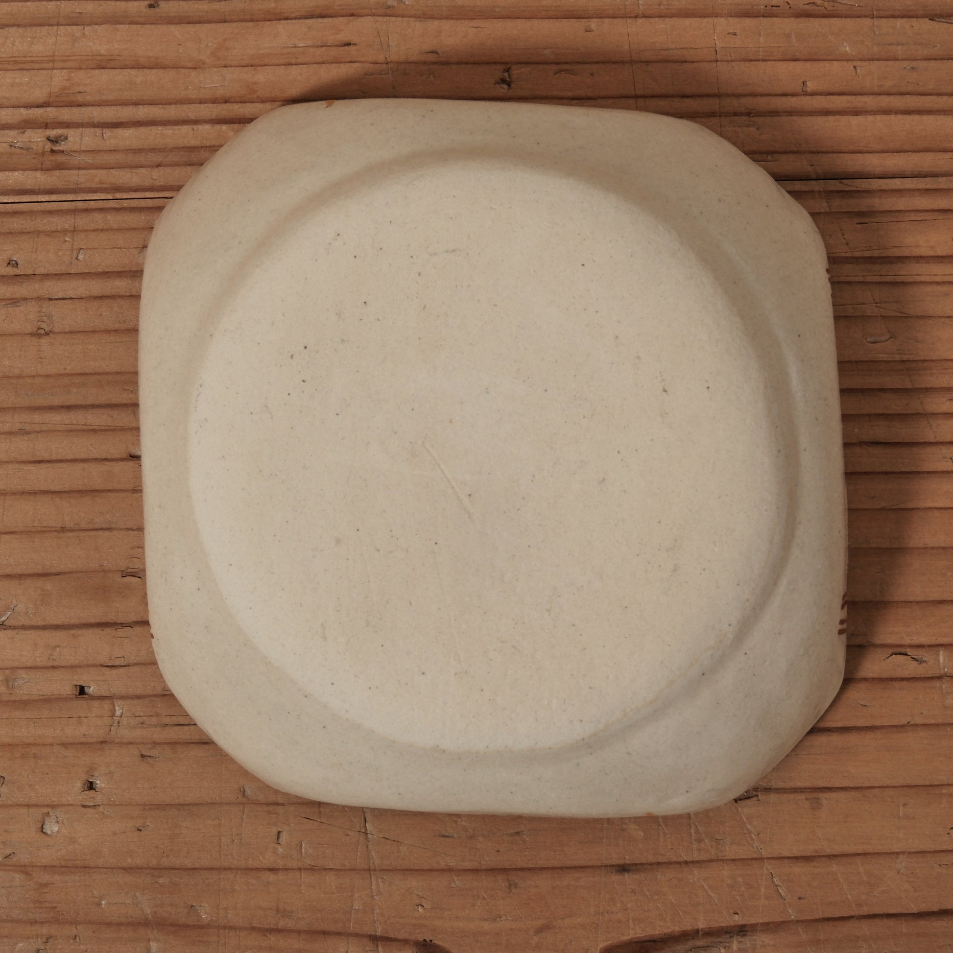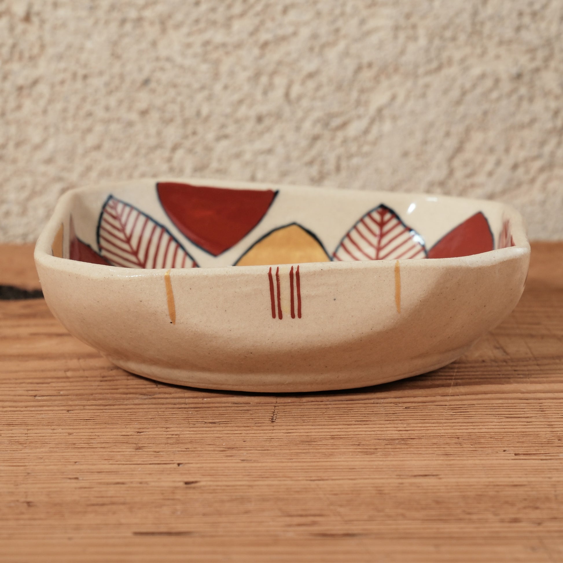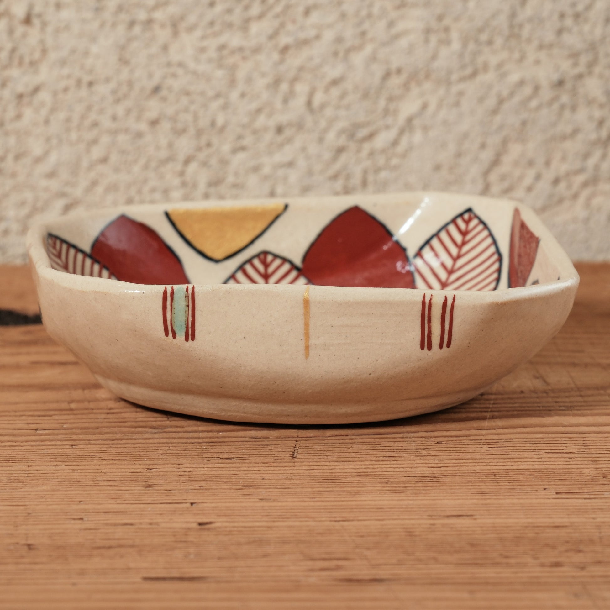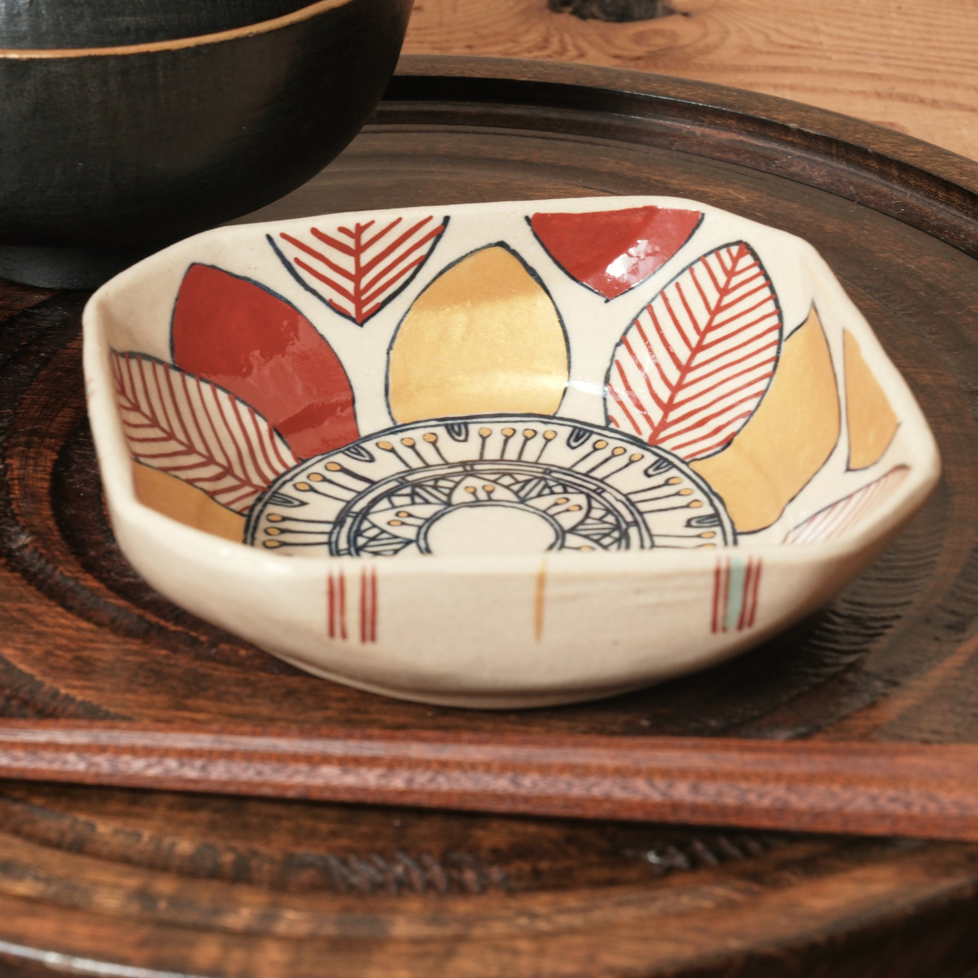 温かな色合いの赤絵と金彩が映える、幅約11cmの角鉢です。