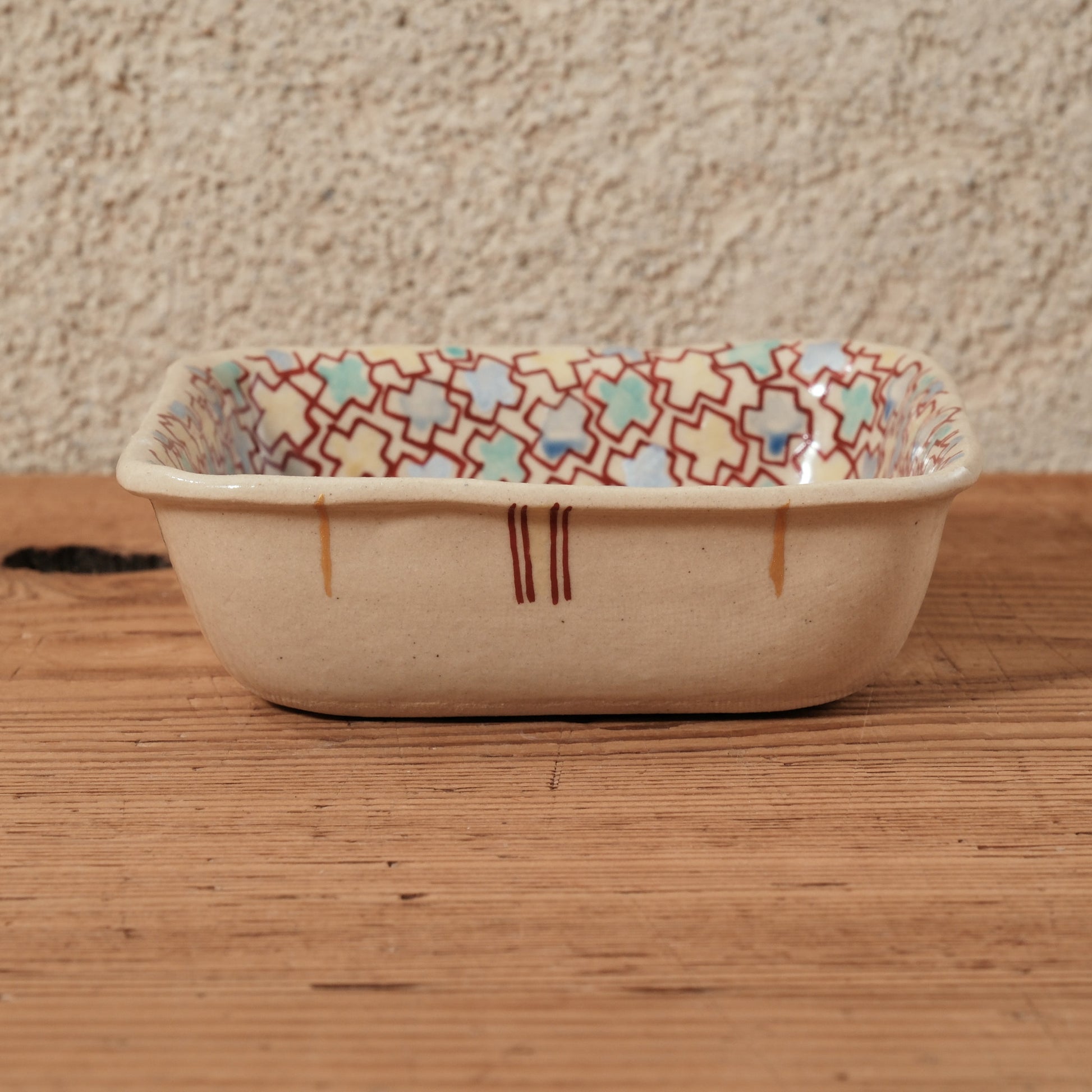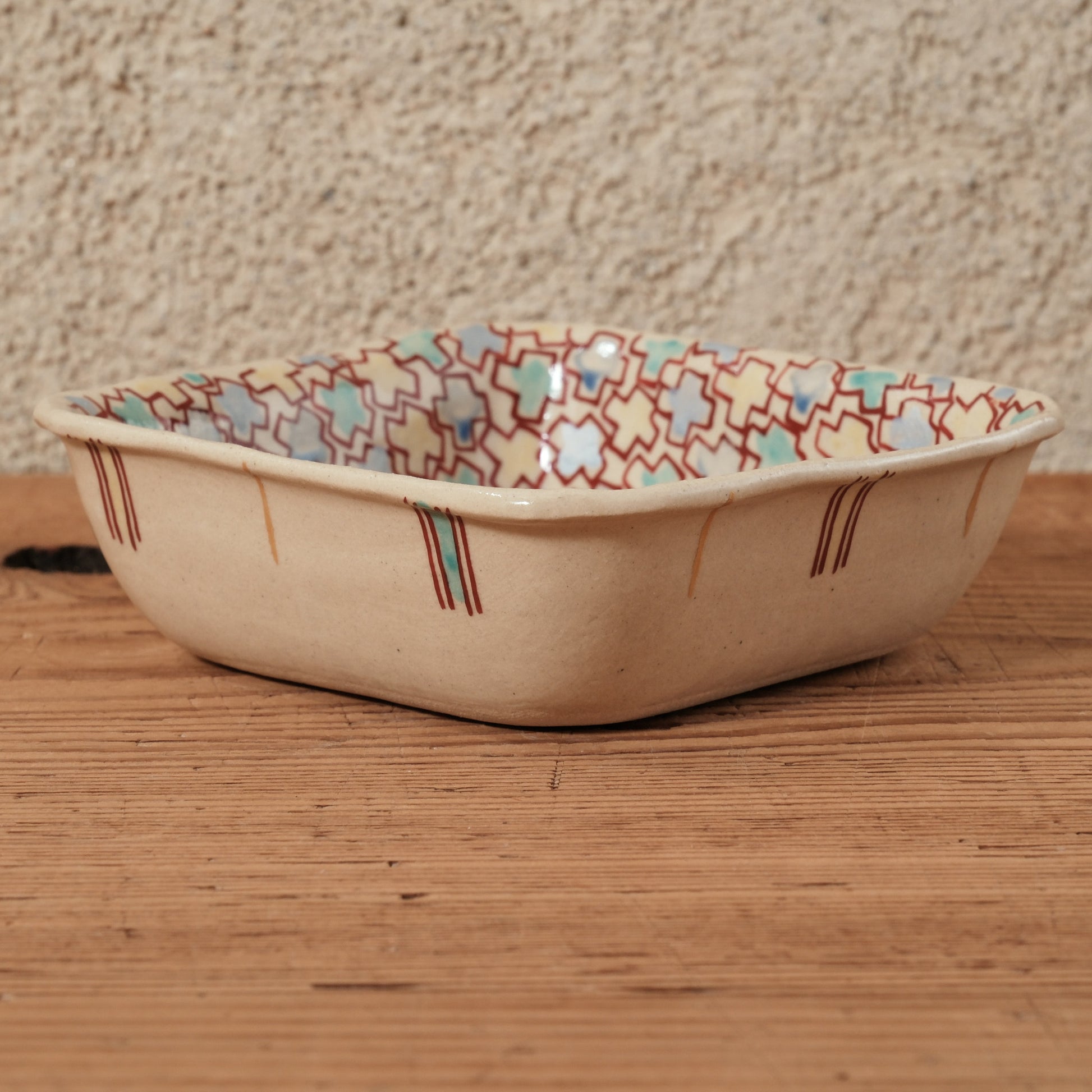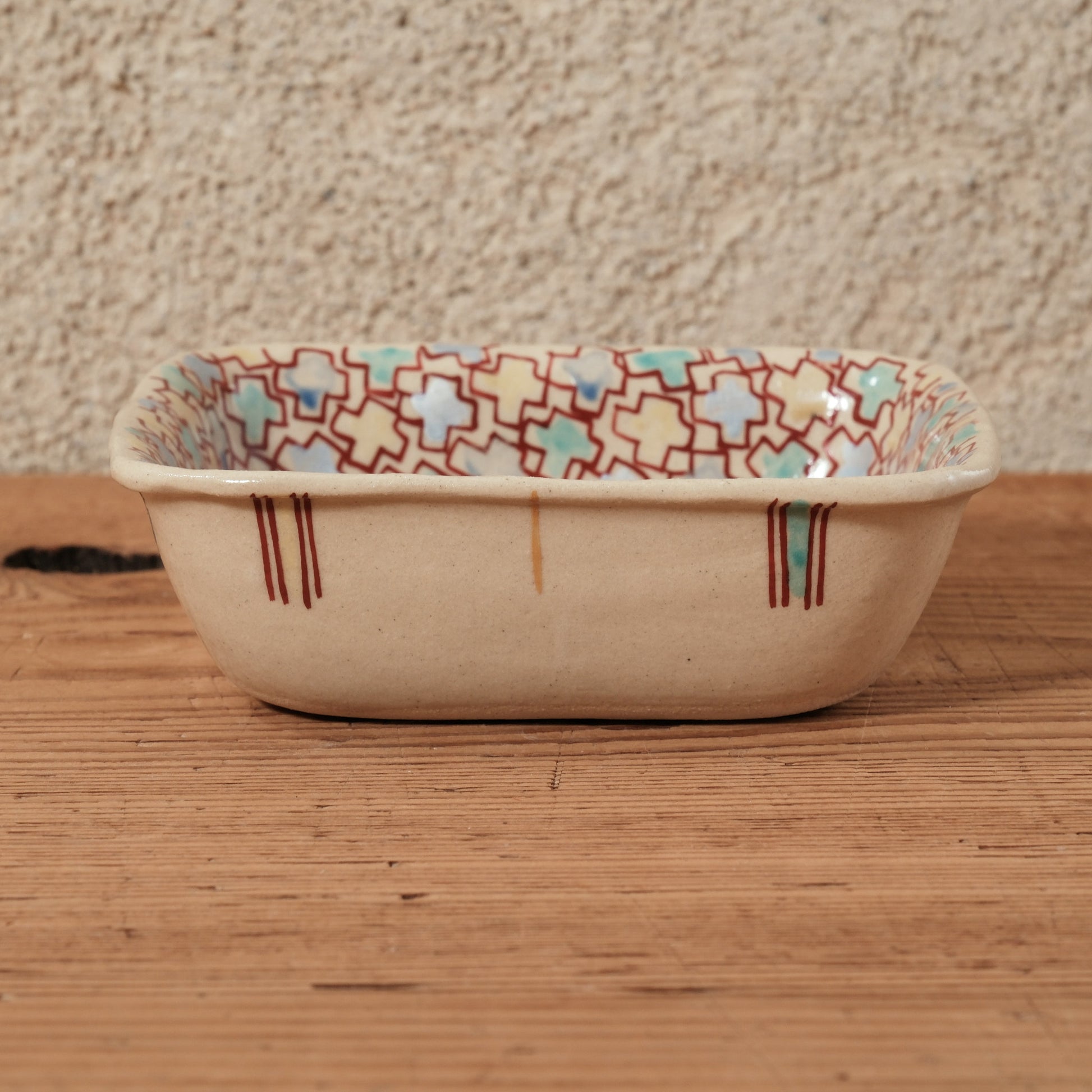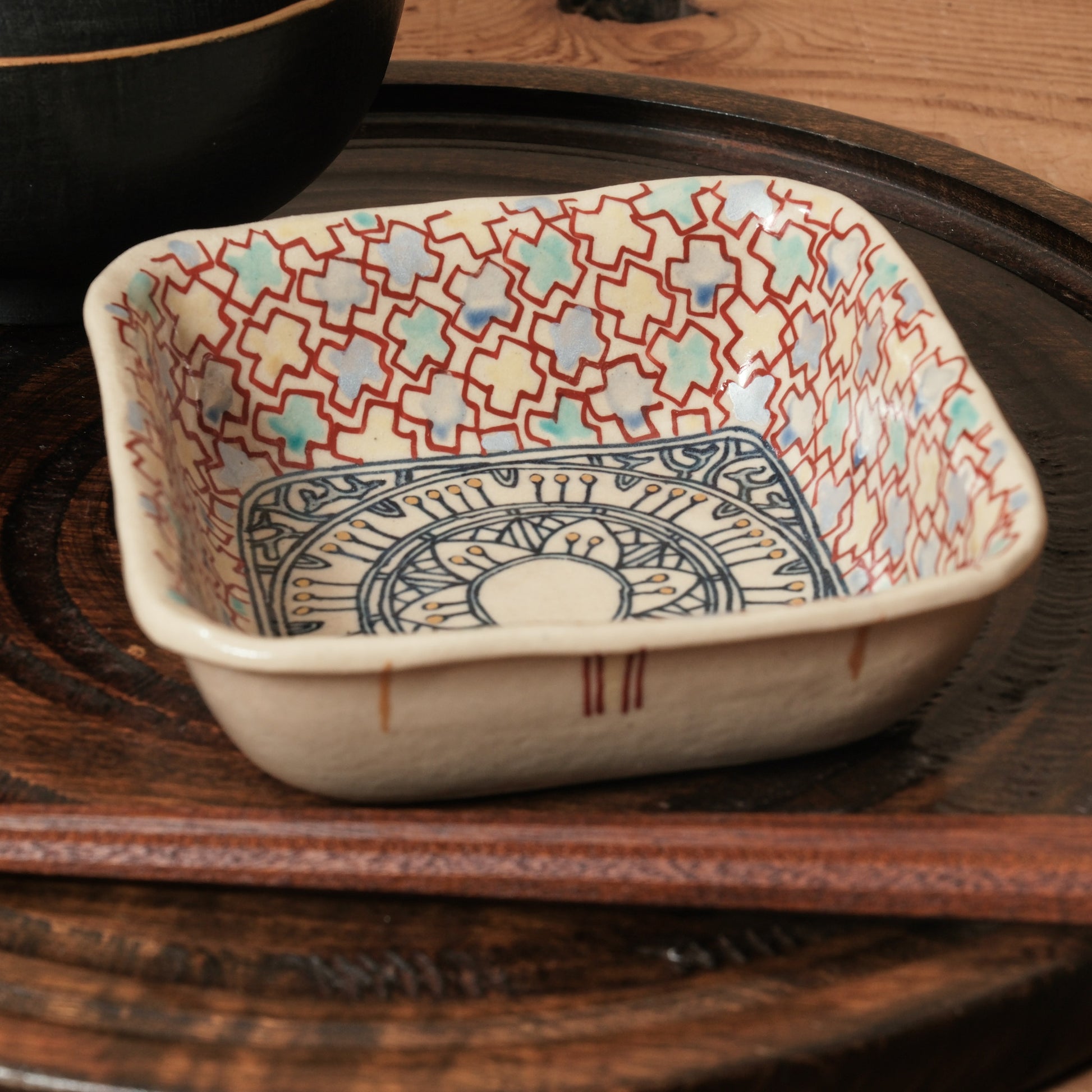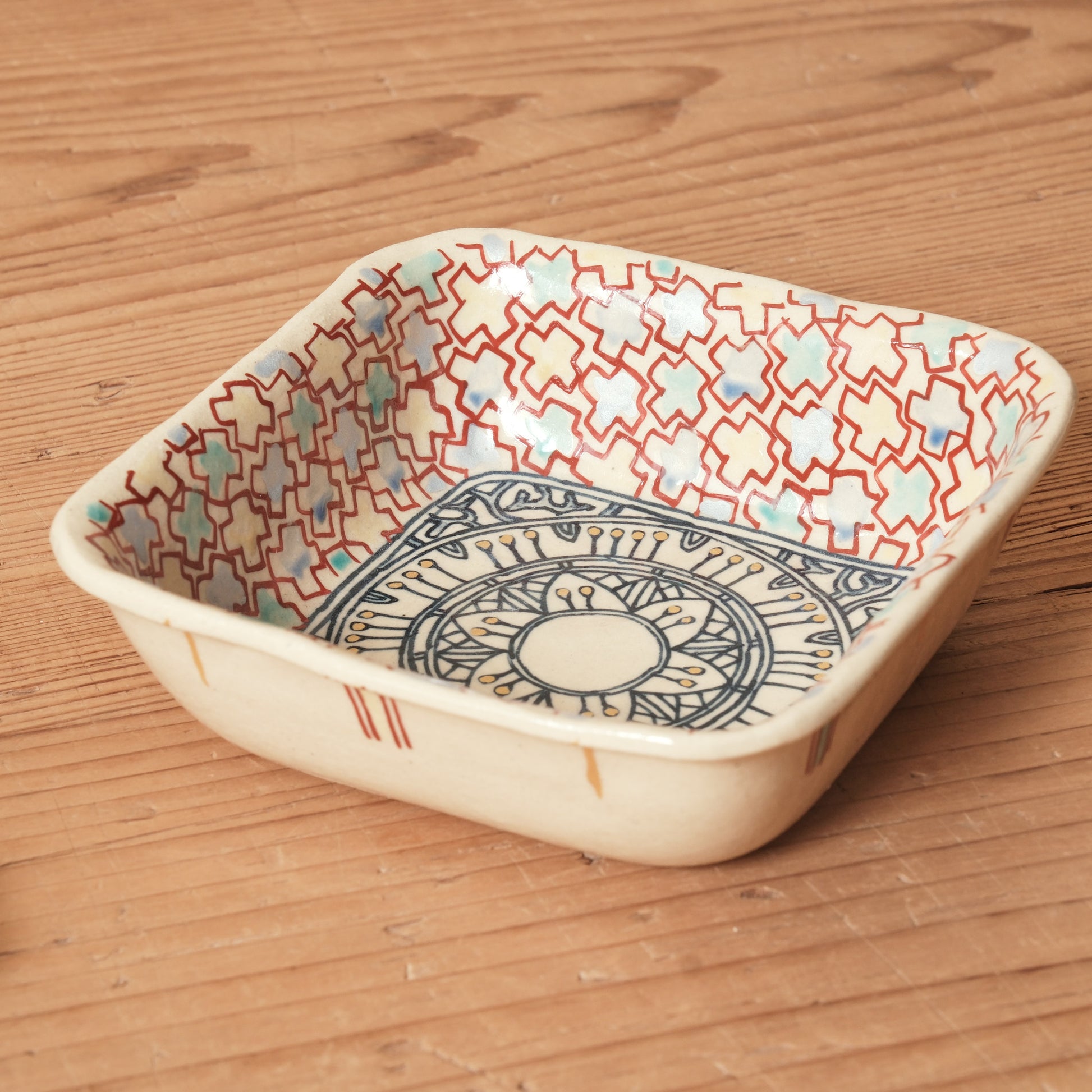 温かな色合いの赤絵と金彩が映える、幅約11.5cmの角鉢です。